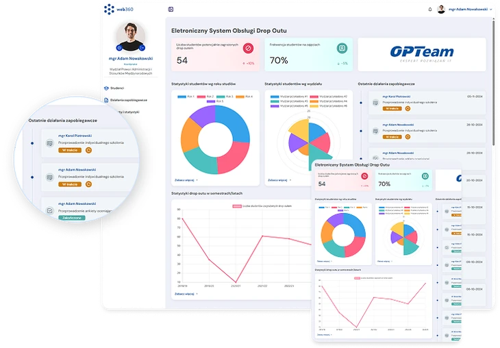 The OPTiDrop App system is a comprehensive solution that supports effective university management to minimize drop-outs. It utilizes data analysis and modeling, scoring, and artificial intelligence mechanisms to precisely identify students at risk. This allows universities to take quick and effective preventative measures, fostering a positive academic experience.