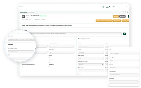 Improve student documentation management at your university by collecting all personal files, applications, requests, certificates, and many other required formalities in one place. Use the e-Student File, an electronic repository that provides dean's office staff with constant access to information about their education progress and reduces the time needed to process matters related to their course of study. Ensure modern management of your course of study while maintaining continuity and security of your documentation.