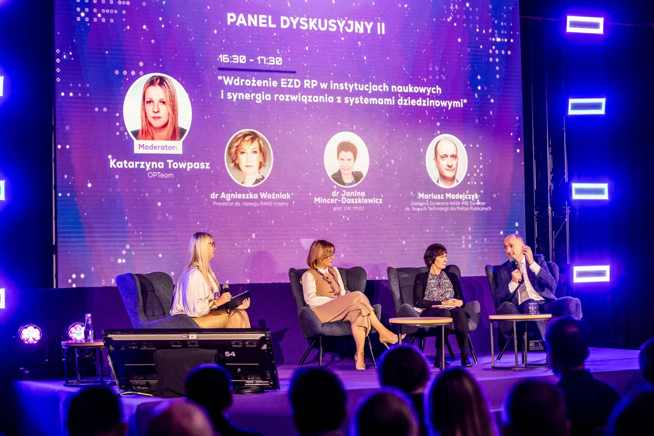 W drugiej części dnia odbył się panel „Wdrożenie EZD RP w instytucjach naukowych i synergia rozwiązania z systemami dziedzinowymi”, gdzie debatowali przedstawiciele uczelni, NASK-PIB i środowisk eksperckich. Dzień zamknęła prelekcja OPTeam dotycząca wyzwań w implementacji EZD RP w realiach uczelni.