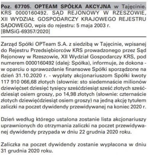 Zarząd Spółki OPTeam S.A. z siedzibą w Tajęcinie, wpisanej do Rejestru Przedsiębiorców KRS prowadzonego przez Sąd Rejonowy w Rzeszowie, XII Wydział Gospodarczy KRS, pod numerem: 0000160492, (dalej: Spółka) informuje, że dokona - w oparciu o sprawozdanie finansowe Spółki sporządzone na dzień 31.10.2020 r. - wypłaty akcjonariuszom Spółki kwoty 117 910 066,68 złotych (słownie: sto siedemnaście milionów dziewięćset dziesięć tysięcy sześćdziesiąt sześć złotych sześćdziesiąt osiem groszy, po 14,98 złotych (słownie: czternaście złotych dziewięćdziesiąt osiem groszy) na jedną akcję tytułem zaliczki na poczet dywidendy przewidywanej na koniec 2020 r.