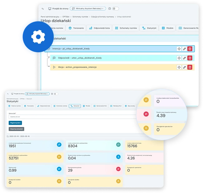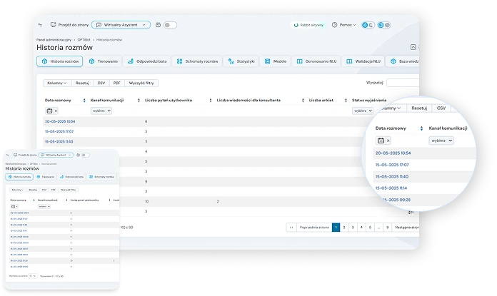 Dostęp do historii konwersacji, listy najczęściej zadawanych pytań i odsetka pytań pozostających bez odpowiedzi.