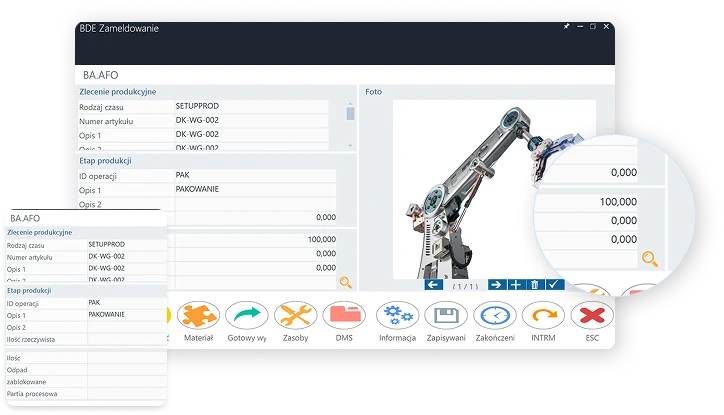 W czasie rzeczywistym pozyskuje dane ze stanowisk produkcyjnych,rejestrując stopień zaawansowania produkcji w momencie trwania poszczególnych operacji. Dostarczane informacje dotyczą czasu pracy, statusu maszyny, stanu urządzeń, zużycia materiałowego i przyjęcia wyrobu. Dokładnie wiadomo, ile w danym momencie wykonywanych jest zadań, na jakim etapie są operacje i ile można ich jeszcze uruchomić. Dzięki temu firma utrzymuje pełną kontrolę nad produkcją i optymalnie wykorzystuje maszyny. Obsługę utrzymania ruchu ułatwia graficzny monitoring zajętości zasobów produkcyjnych.