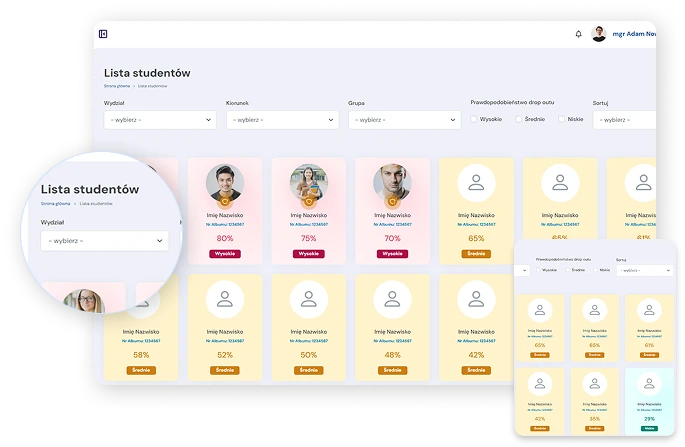 Czytelne statystki na temat ryzyka drop out’u, przyczyn, a także efektywności podjętych inicjatyw zapobiegawczych.