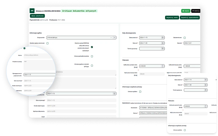 Obieg umów zapewniający pełną cyfryzację obszaru procedowania umów w formie zdigitalizowanej.