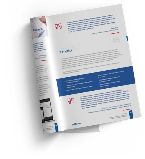 Rozwiązanie do odczytów inwentaryzacyjnych stworzone przez OPTeam jest odpowiedzią na nasze potrzeby biznesowe. Obecnie prace inwentaryzacyjne trwają nie dłużej niż 3 dni, a osoby koordynujące nimi mają zdalną kontrolę online nad całym procesem. Tym samym zyskują pewność, że wynik spisu będzie poprawny i żadne błędy nie wystąpią w wykazie środków trwałych. Przełożyło się to na oszczędności, ponieważ inwentaryzacja nie angażuje nadmiernie zasobów ludzkich potrzebnych przy realizacji innych celów operacyjnych.